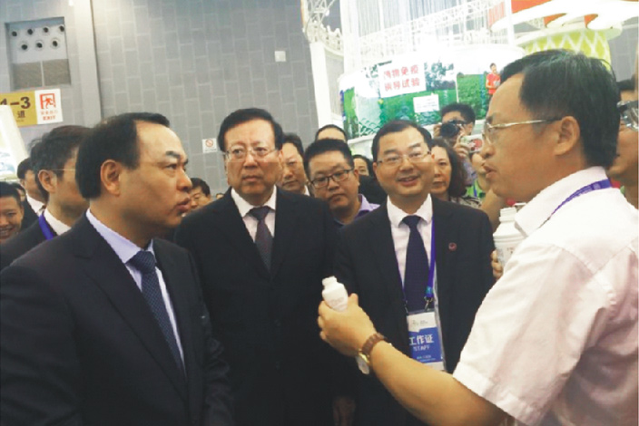 成都市農委總農藝師姚光貴向成都市委唐書記介紹可以喝的太抗生物農藥(2016年創交會)